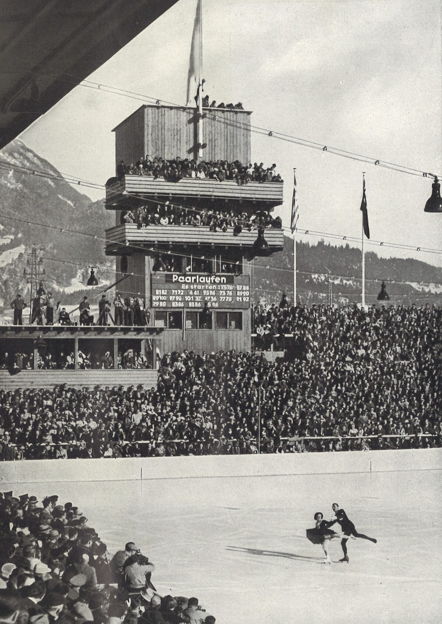 For the planned 1940 Winter Olympic Games, architect Hanns Ostler once again designed an ambitious multifunctional complex with seating for 21,000 spectators. All ice sports were to take place there regardless of weather conditions. In addition to the original 1936 rink, plans included a speed skating track, a training rink, and a connecting tunnel. Due to the outbreak of the Second World War, most of this project could not be realized; only the new grandstands of the existing ice stadium were completed, providing 2,400 seats and space for 8,600 standing spectators.
